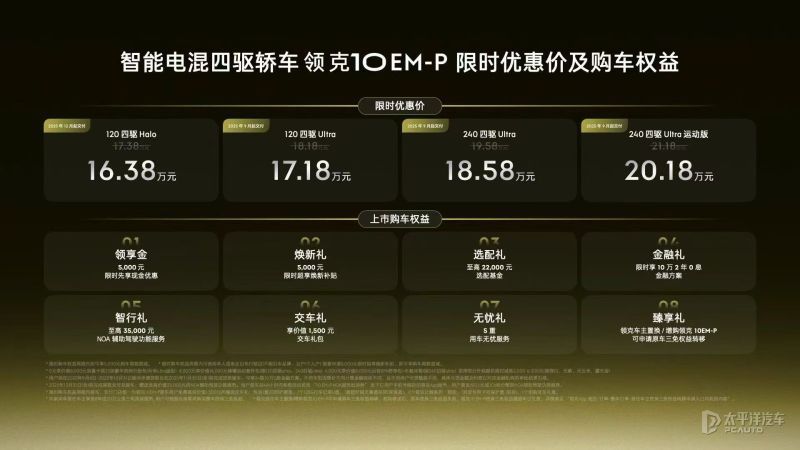领克10 EM-P在9月8日上市,四款车型的售价区间为17.38-21.18万元,限时优惠价16.38-20.18万元。它是基于CMA Evo原生新能源架构打造,搭载1.5T全新电混引擎+DHT Evo混动电驱,系统综合功率390千瓦,纯电续航最高240km,并采用前双叉臂+后五连杆独立悬架。此外,领克10 EM-P还搭载英伟达Thor芯片和千里浩瀚智能辅助驾驶H7方案。